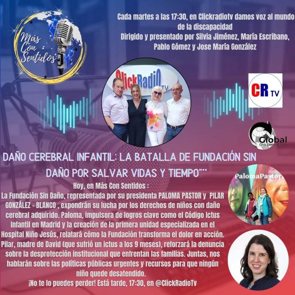 Pilar González Blanco y Paloma Pastor fueron entrevistadas por el equipo de Más Con Sentidos en Click Radio, pasaron un rato estupendo hablando sobre Daño Cerebral Adquirido Infantil, nuestras propias experiencias y reivindicando más recursos para la discapacidad.
