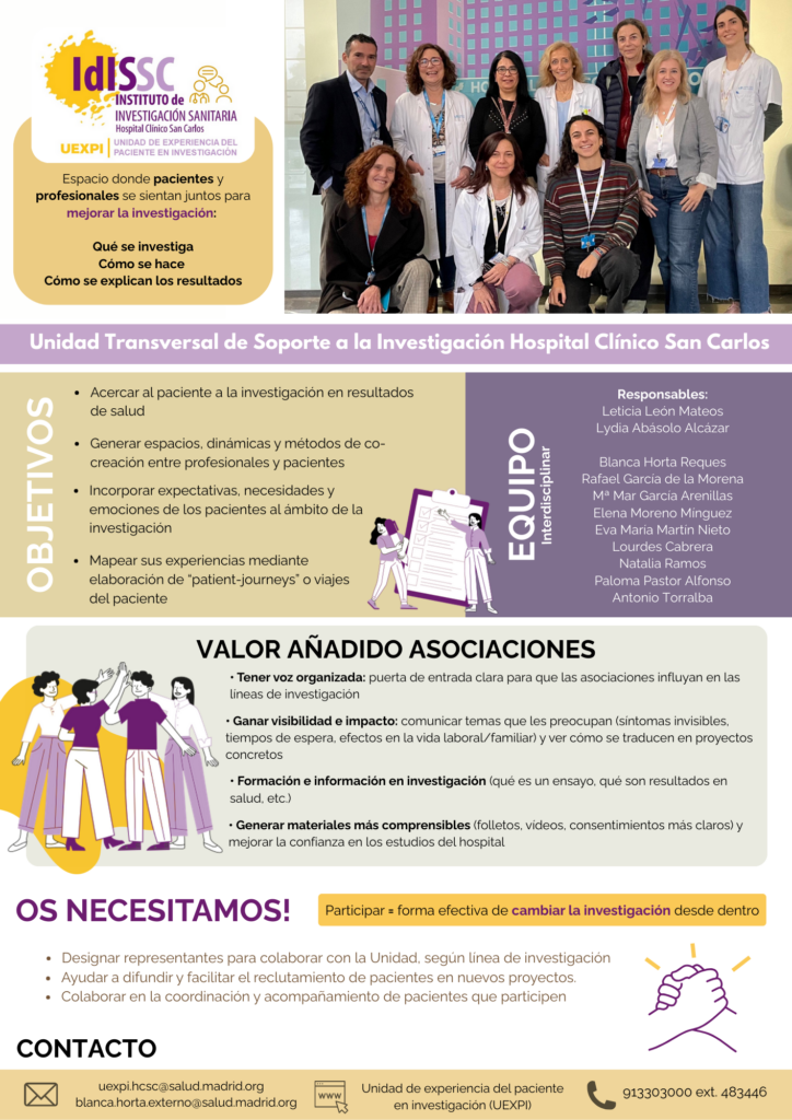 La Unidad de Experiencia del Paciente en Investigación es una iniciativa pionera en un Instituto de Investigación Sanitaria. Se trata de una unidad transversal, constituida por diversos profesionales y pacientes, que presta apoyo a los investigadores para integrar a los pacientes en sus proyectos de investigación.
